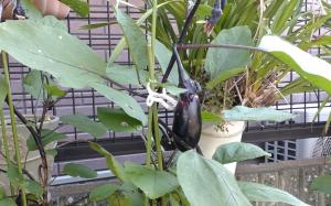 東側の庭で育てる茄子にもたくさん花が。実が少しずつ育つ。
