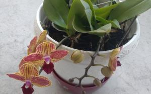 南側のベランダで鮮やかな緑いろの葉にお花が咲く胡蝶蘭。もう何年も育っている