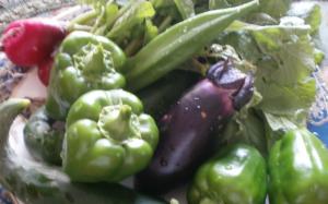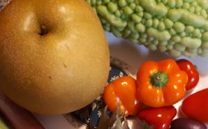 宮崎のお野菜堀口ファームの堀口さんからおすすめお野菜お尋ね、届けて頂いた色とりどりのカプセルパプリカ、薄緑色したゴ―ヤ、オクラ、秋ミョウガ、梨。