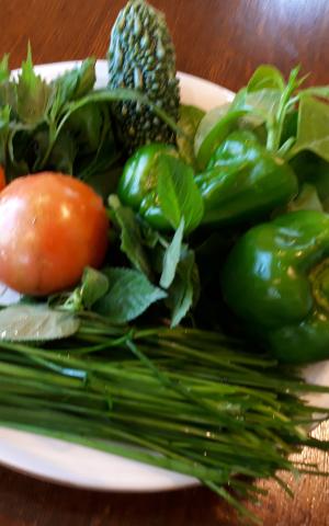 今日は、祈念時間に合うように早目に庭の水やりをしてお野菜を収穫した。トマトを4個摘み取った。ピーマン、少しの大葉、モロヘイヤ、ゴーヤ、助産師の先輩に苗をいただいた韮が育っていた。