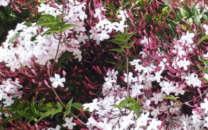 しっかりと葉や茎が育ち、赤っぽい濃いピンクのがくに白いお花が咲いている。