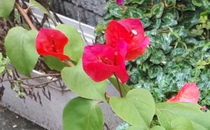 5月快晴。昨年ご縁があって手にしたブーゲンビリア。寒さに弱いお花が、冬を越して見事に赤い花を実らせました。昨年と同じように薫風にそよそよと揺れ咲いている姿を見て感激しています。赤いお花。華麗で可愛いのです。